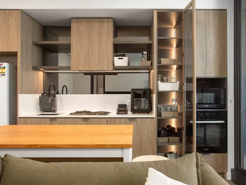 The streamlined kitchen includes an oven, stovetop, dishwasher, microwave, fridge, air fryer, and Nespresso machine, along with essential cookware. A central island bench serves as both a dining space and a practical work-from-home setup.