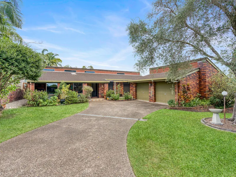 A carport, garden shed, and external laundry add practicality, while the landscaped gardens